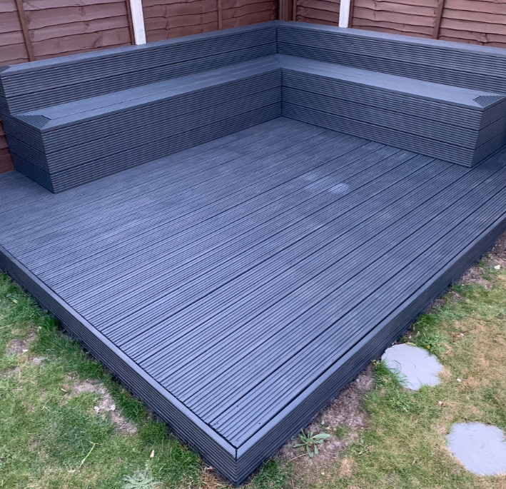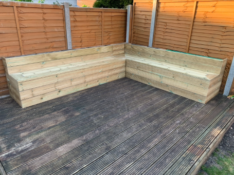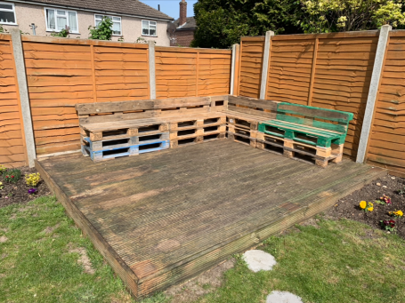 Working within a relatively tight budget, we sourced reclaimed timber pallets to build a solid framework for bespoke L-shaped decked benches. These were then finished using traditional softwood decking boards to match the existing base, and coated in a modern grey, non-slip decking paint. The result is a stylish, practical seating area that feels open, inviting, and perfectly suited for social gatherings.