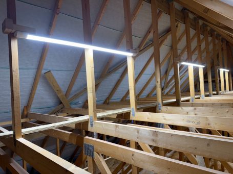 To support the flooring, we constructed a framework using 3x2 timber sections, also sourced by the customer from a local reclaimed yard, ensuring the entire installation remained in line with their eco-conscious approach. To complete the space, we upgraded the existing single fluorescent light to three energy-efficient LED strip lights, providing brighter, more reliable illumination while reducing energy consumption.